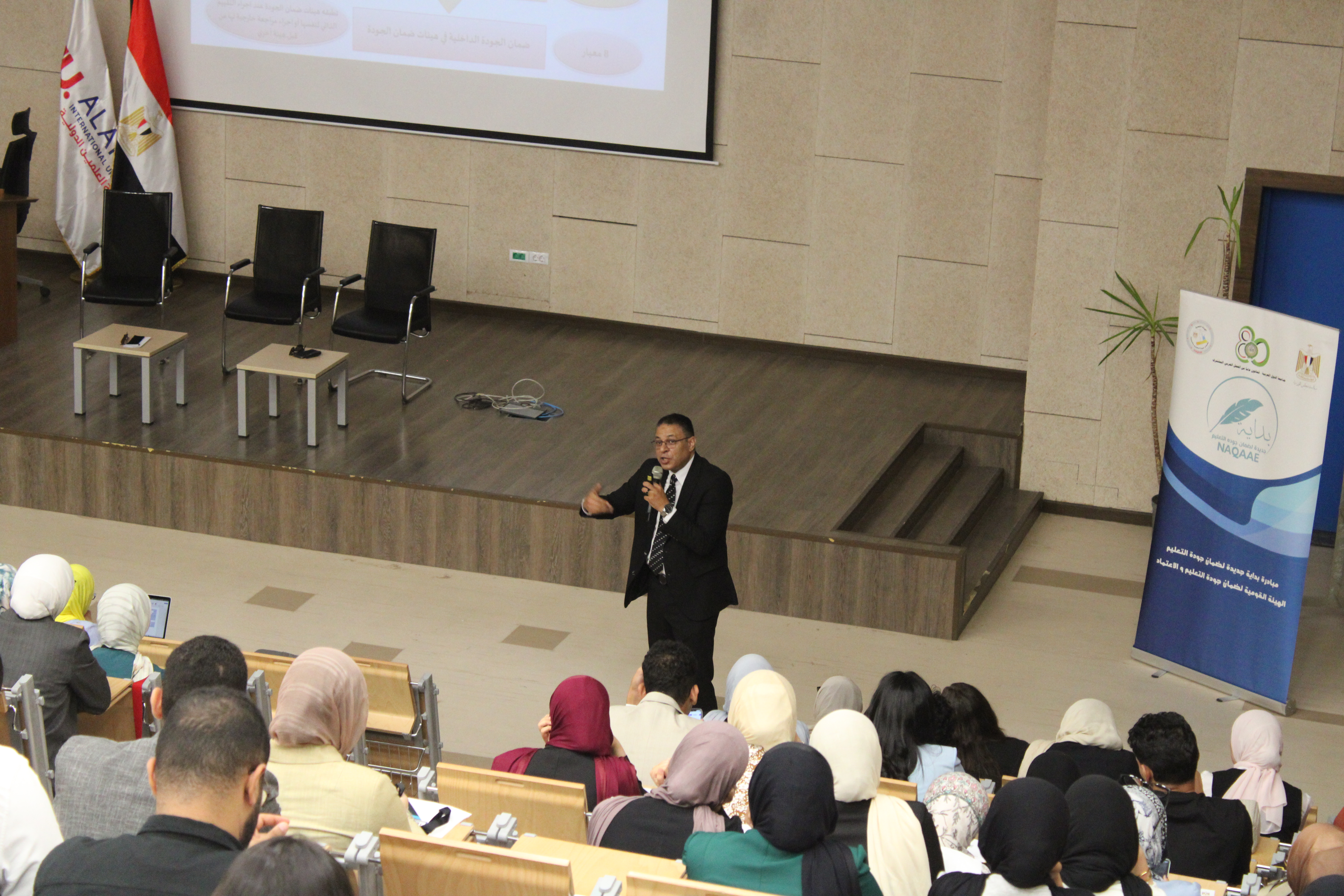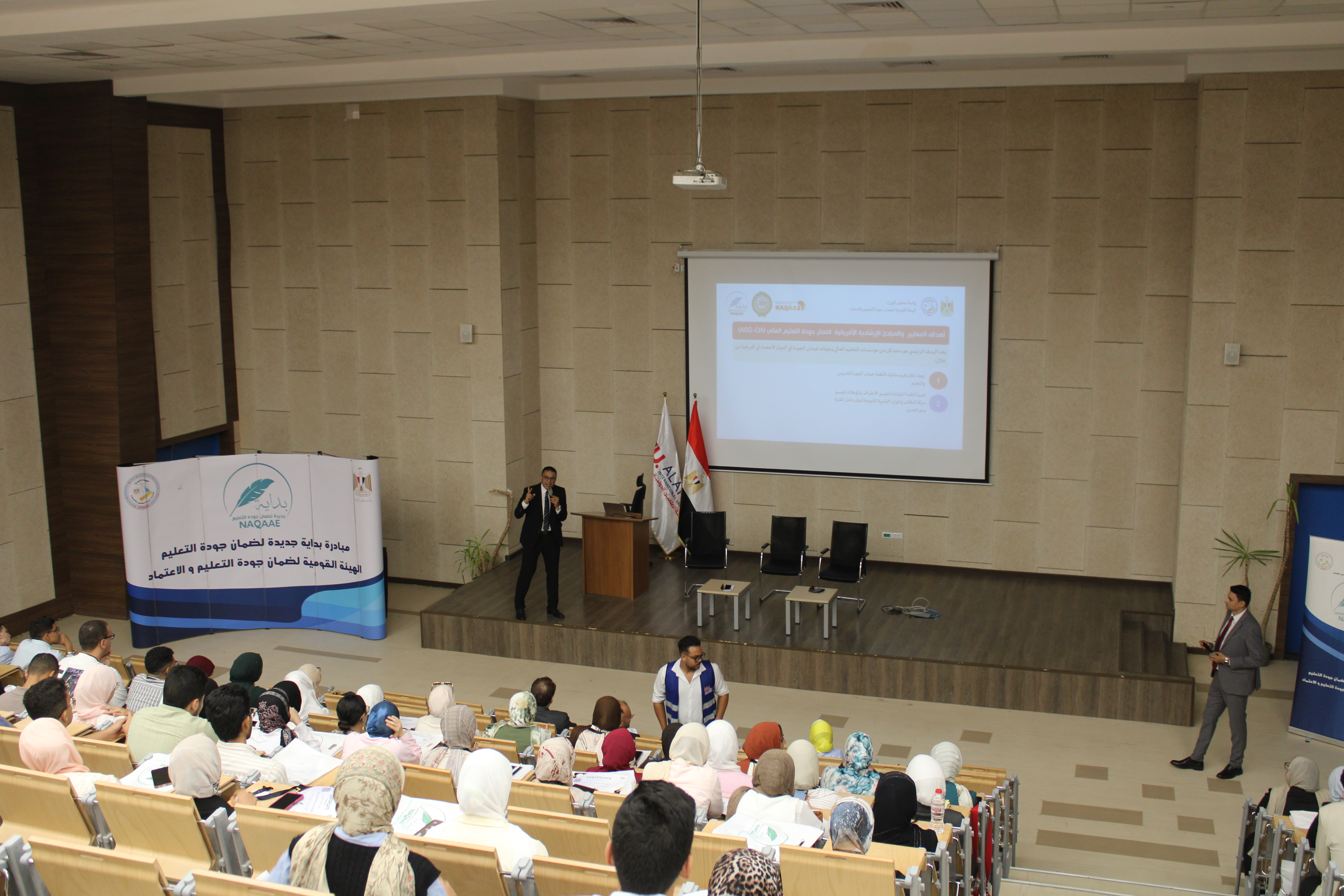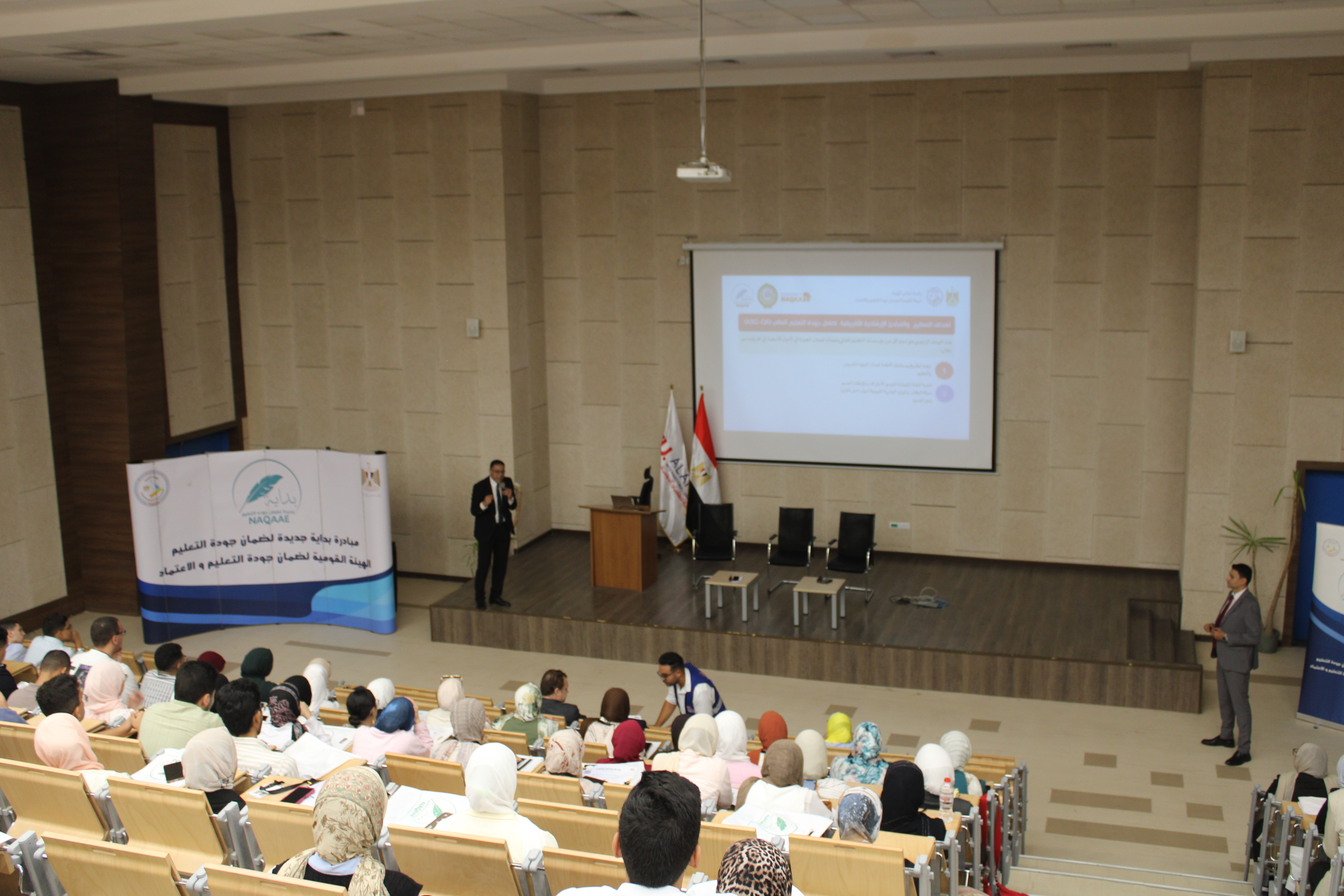 وأعقب ذلك جلسات تدريبية قدمها كل من الدكتور هشام عبد الناصر والدكتور حسين خاطر، تناولت موضوعات متنوعة حول معايير الاعتماد الأكاديمي وأهمية تطبيق مفاهيم الجودة في بناء الشخصية الجامعية المتميزة.