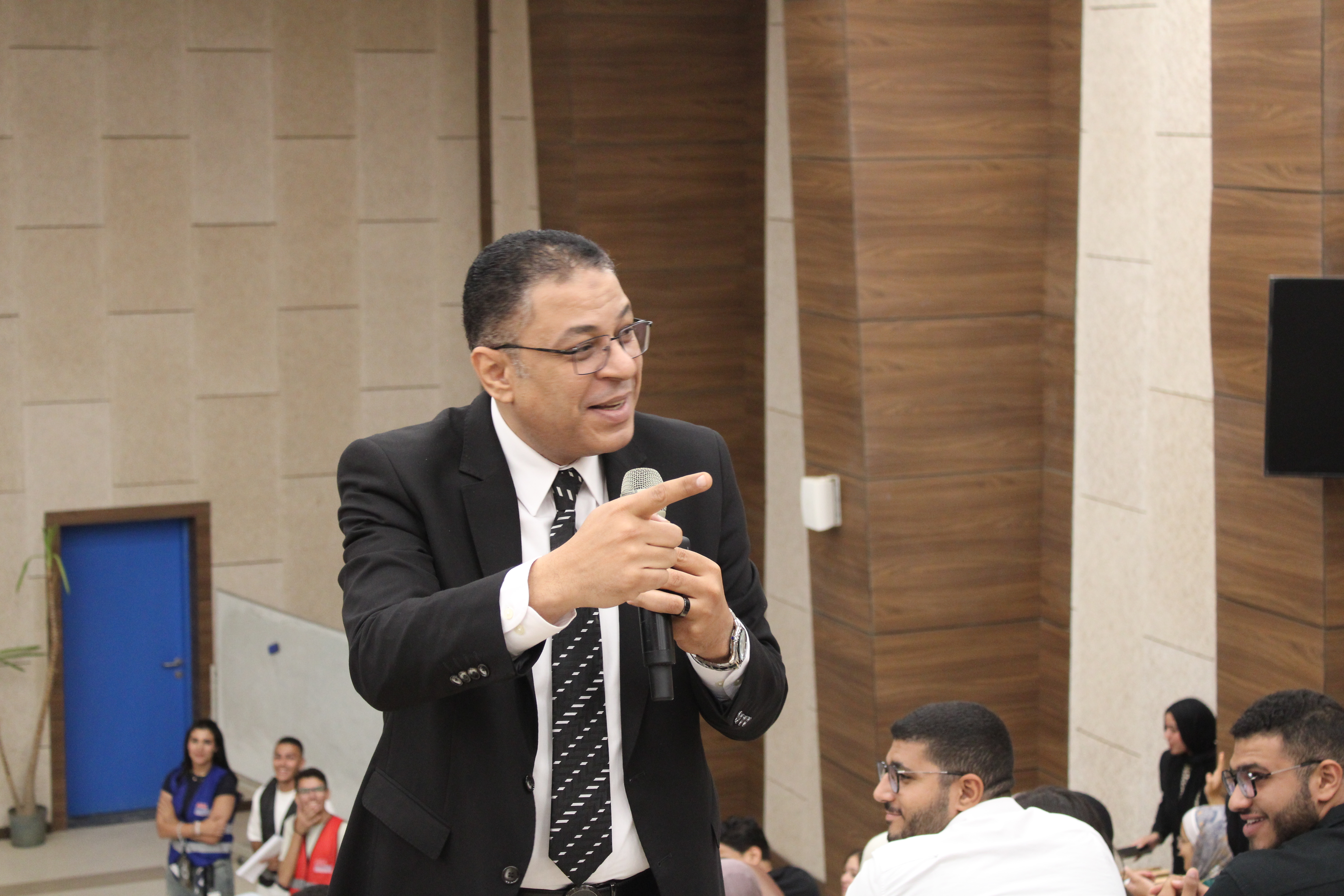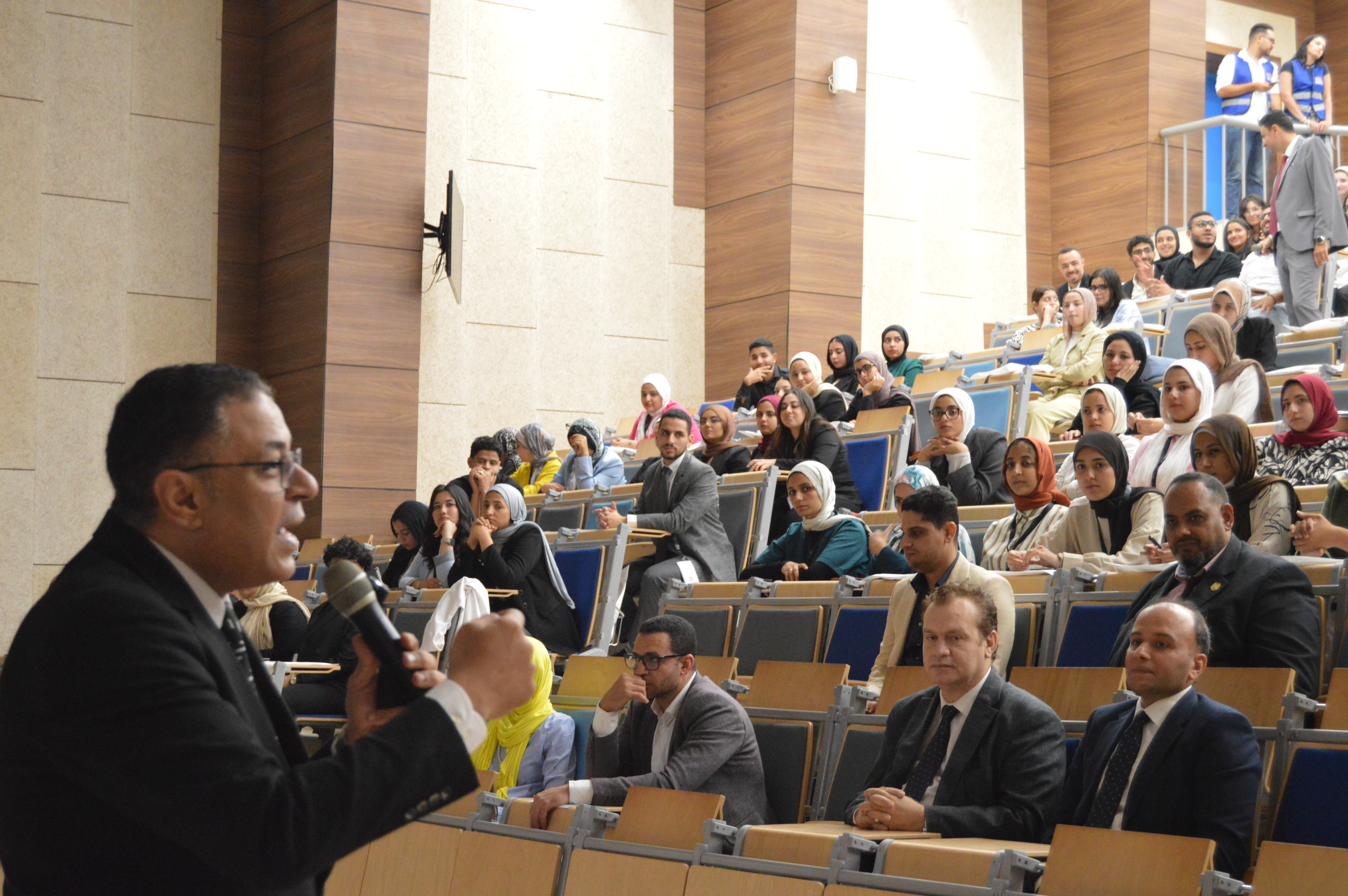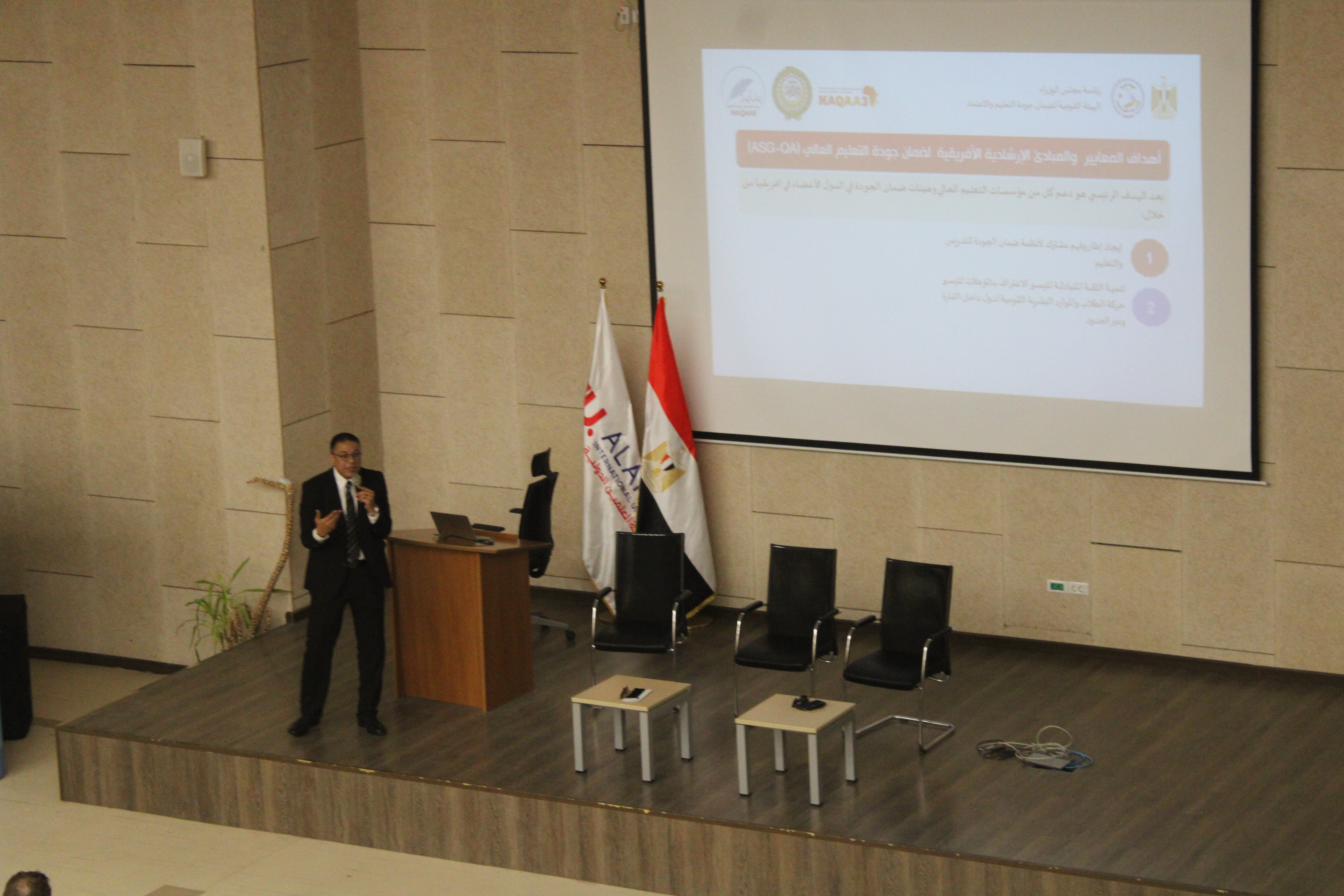 وأعقب ذلك جلسات تدريبية قدمها كل من الدكتور هشام عبد الناصر والدكتور حسين خاطر، تناولت موضوعات متنوعة حول معايير الاعتماد الأكاديمي وأهمية تطبيق مفاهيم الجودة في بناء الشخصية الجامعية المتميزة.